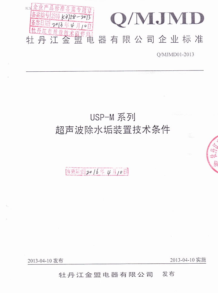 2013年4月10日,牡丹江金盟電器有限公司《USP-M系列超聲波除水垢裝置技術(shù)條件》正式通過技術(shù)監(jiān)督局審核通過,同時(shí)發(fā)布并實(shí)施。